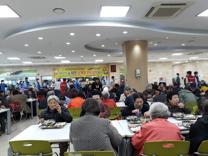 경기 평택시 중앙동 환경보존위원회는 지난 6일 중앙동 지역내 노인뿐 아니라 북부노인복지관을 방문하는 노인을 초대해 삼계탕을 대접하는 ‘삼계탕 나눔 봉사’를 진행했다. 사진은 행사에 참석한 노인들이 삼계탕을 먹고 있는 모습.(사진제공=평택시청)