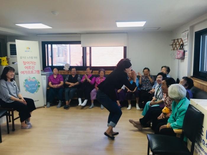 경기 수원시 팔달구 고등동은 19일 지역내 고등분회 및 고등촌 경로당에서 노인 60여명을 대상으로 '찾아가는 웃음치료'를 진행했다. 사진은 웃음치료 강사가 노인들에게 노래 및 율동을 알려주고 있는 모습.(사진제공=팔달구청)