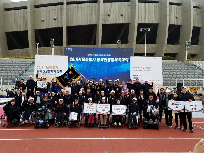 서울 노원구가 최근 잠실종합운동장 보조경기장에서 개최된 ‘2019 서울시 장애인 생활체육대회’에서 우승했다. 선수단은 400m 계주 등에서 1위를 하고, 어울림 풋살에서 2위를 하는 등의 활약을 펼쳤다. 사진은 기념촬영을 하는 모습.(사진제공=노원구청)