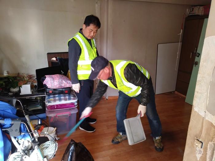 인천 계양구 계양2동 자율방범대는 최근 임학동 한일상가 근처 거동이 불편한 홀몸노인 가구를 방문해 오래된 장판, 미닫이문, 싱크대, 유리 교체, 도배 등의 주거환경 개선사업을 했다. 사진은 대원들이 집안 청소를 하고 있는 모습.(사진제공=계양구청)