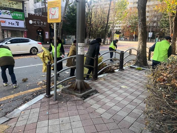 경기 수원시 권선구 권선2동이 최근 권중로 일대 낙엽쓰레기 수거 등의 쾌적한 환경 정비에 나섰다. 이날 지역 11개 단체 및 환경관리원 50여명은 대로변에 쌓여 있는 낙엽과 함께 가로화단 및 이면도로의 쓰레기를 청소했다. 사진은 낙엽을 수거하는 모습. (사진제공=권선구청)