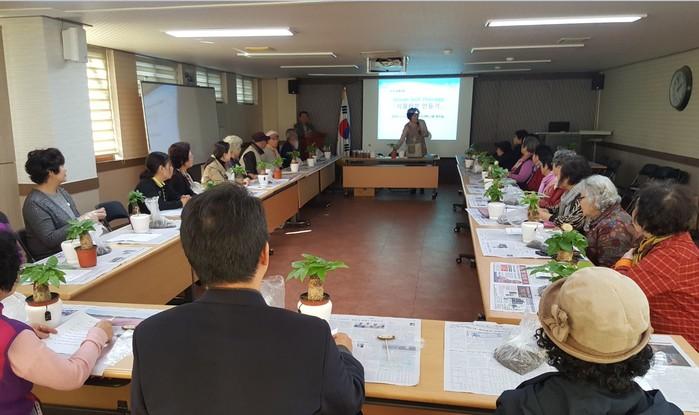 서울 강동구 둔촌2동 주민센터는 최근 이웃의 돌봄과 정서적 복지 지원이 필요한 홀몸노인 25명을 대상으로 직접 반려식물을 만들어보는 ‘Green Self Therapy 식물 화분 만들기’ 행사를 했다. 사진은 노인들이 설명을 듣는 모습.(사진제공=강동구청)