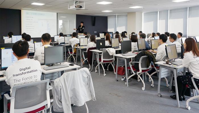 | ▲ 하나금융그룹 임직원들이 인천 청라에 위치한 하나글로벌캠퍼스에서 스크래치를 활용한 코딩교육을 받고 있다.(사진제공=하나금융그룹) |