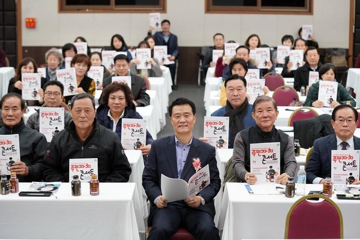 서울 성북구가 최근 성북아트홀에서 '2019년 주민자치콘서트'를 개최했다. 이날 행사는 이승로 구청장을 비롯해 주민, 구 관계자 등이 참석해 생활속 갈등사례를 공유하고 해결방법을 함께 고민했다. 사진은 이 구청장(가운데)과 주민들의 기념촬영 모습. (사진제공=성북구청)