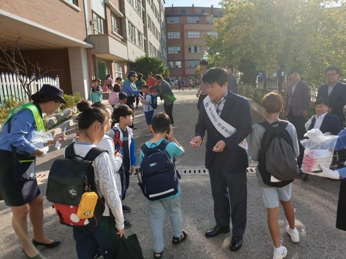인천 계양구는 19일 당산초등학교 인근에서 어린이 교통사고 예방 및 안전한 통학로 확보를 위한 ‘시민단체와 연계한 교통사고 줄이기(교통안전) 캠페인’을 실시했다. 사진은 박형우 구청장이 어린이들에게 안전 보행 관련 홍보물품을 나눠주는 모습.(사진제공=계양구청)