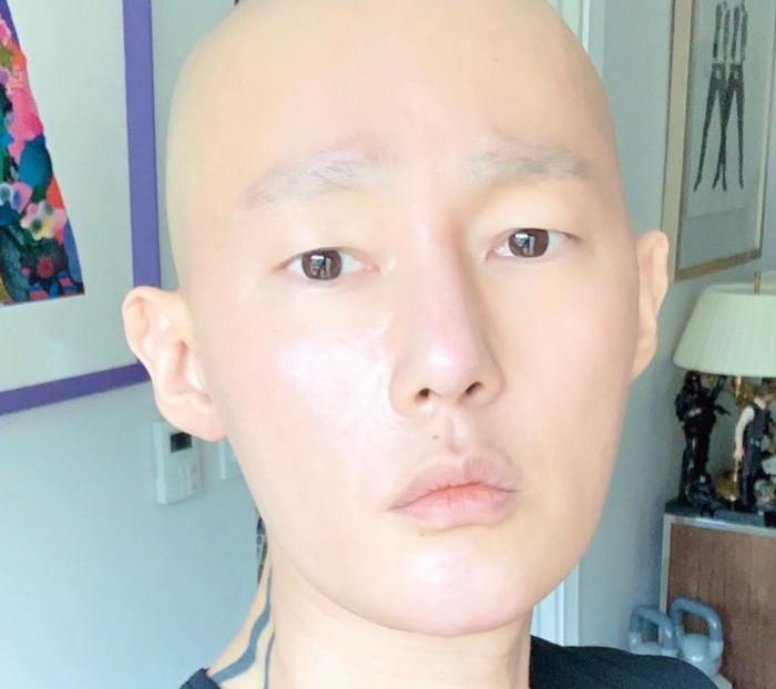공개된 사진 속 허지웅은 혈액암 때문에 머리와 눈썹을 민 모습으로 카메라를 쳐다보고 있는 모습이 담겨 있다.