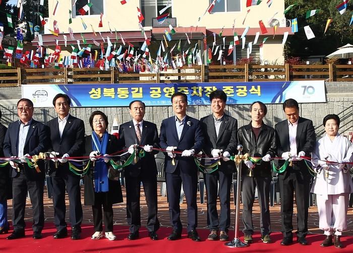 서울 성북구가 ‘지붕없는 박물관’이라 불리는 성북동에 거주 주민과 관광객 주차 불편 해소를 위해 ‘성북동길 공영주차장’을 조성하고 최근 준공식을 개최했다. 사진은 이날 준공식에 참석한 이승로 구청장(가운데)과 관계자들의 테이프 커팅 모습. (사진제공=성북구청)
