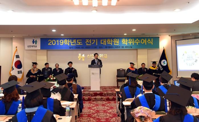 안병용 경기 의정부시장은 지난 19일 신한대학교 시온관 1층 세미나실에서 열린 신한대학교 대학원 '2019학년도 전기대학원 학위 수여식'에 참석했다. 사진은 안 시장이 인사말을 하는 모습.(사진제공=의정부시청)