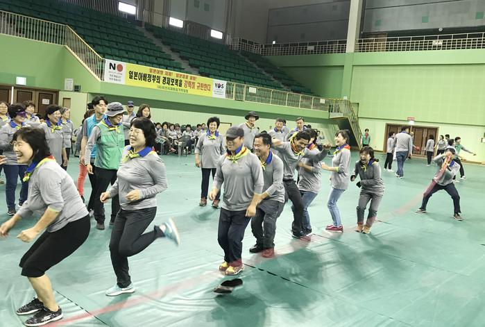 '2019 서산시새마을지도자 한마음대회'가 30일 충남 서산시민체육관에서 남녀지도자 및 시민 850여명이 참여한 가운데 개최됐다. 이날 행사는 우수 도자 표창, 장학금 전달, 체육행사와 읍·면·동 장기자랑 순으로 진행됐다. 사진은 체육행사 모습. (사진제공=서산시청)