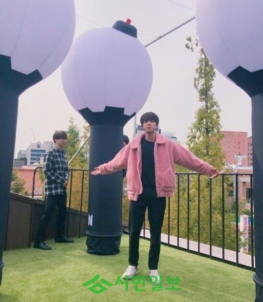 진이 방탄소년단 멤버들과 거대 아미밤 사이에서 인증샷을 남겨 화제다.