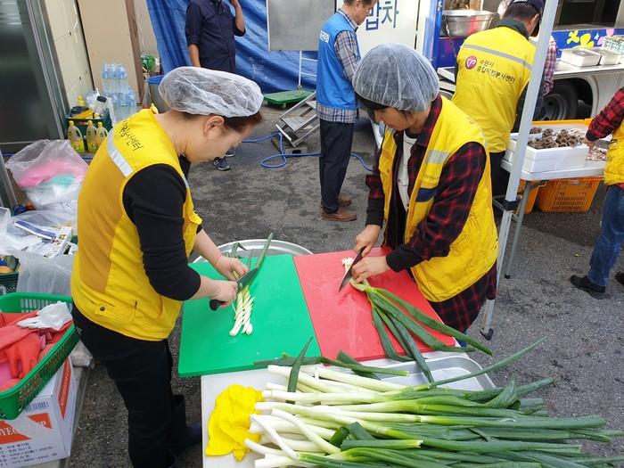 경기 수원시 팔달구 지동에서는 18일 동 행정복지센터 주차장에서 지역내 홀몸노인 300여명을 대상으로 ‘사랑의 밥차’ 봉사활동을 실시했다. 사진은 봉사활동에 참여한 관계자들이 음식을 만들고 있는 모습.(사진제공=팔달구청)