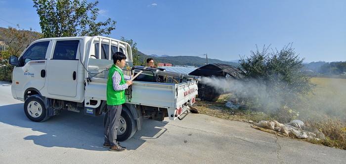 경기 동두천시 상패동 새마을지도자 자율방역반은 아프리카돼지열병(ASF) 확산 방지를 위해 최근 축산농가가 많이 밀집해 있는 8~10통 일대를 중심으로 약 2시간 동안 집중 방역을 실시했다. 사진은 방역반이 소독작업을 하고 있는 모습.(사진제공=동두천시청)