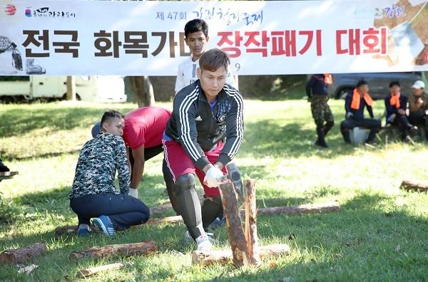 | 강진군이 제 47회 강진청자축제 기간 관람객들을 대상으로 화목가마 장작패기 프로그램을 운영한 가운데 한 관람객이 단 번에 장작을 쪼개고 있다.=사진, 강진군 제공 |