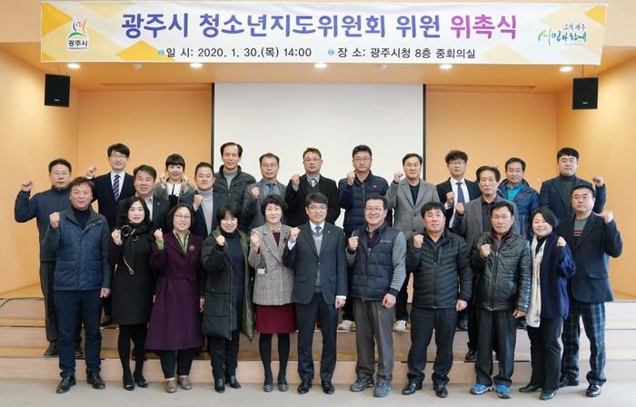 경기 광주시가 최근 시청 중회의실에서 '청소년지도위원회 위원 위촉식'을 열고 위원 30명을 위촉했다. 위원들은 앞으로 3년간 읍·면·동 별로 청소년 생활지도, 유해환경 계도 활동 및 캠페인 등의 임무를 수행한다. 사진은 위촉된 위원들의 기념촬영 모습. (사진제공=광주시청)