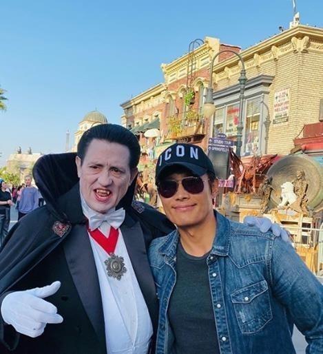 게재된 사진 속 이병헌은 미국 LA에 위치한 유니버셜 스튜디오에서 드라큘라와 포즈를 취하고 있는 모습이 담겨있다.
