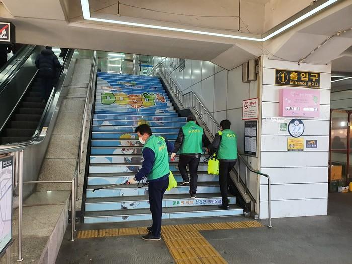 새마을지도자 서울 도봉구협의회 방역봉사대가 도봉로변 버스정류장 20곳, 지하철 역사 주변 등을 중심으로 휴대용 방역 압축 분무기를 사용해 신종 코로나바이러스 대비 방역활동을 하고 있다. 사진은 창동역 1번 출구에서 방역 작업을 하는 모습.(사진제공=도봉구청)