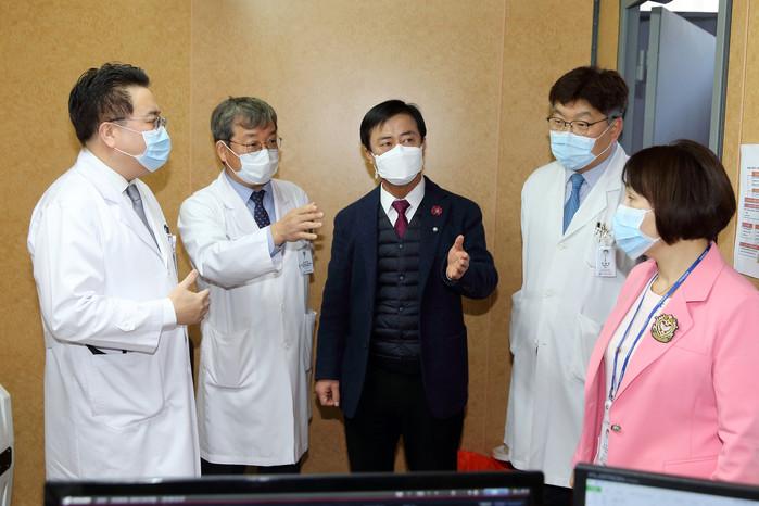 이강호 인천 남동구청장이 최근 신종 코로나바이러스의 지역 확산 방지를 위해 적극적인 조치를 지시했다. 사진은 길병원 선별진료소를 방문한 이 구청장(가운데)이 의료진들과 함께 바이러스 확산방지 대책에 대해 논의하고 있는 모습.(사진제공=남동구청)