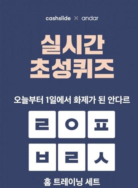 5일 캐시슬라이드는 "오늘부터 1일에서 화제가 된 안다르 ㄹㅇㅍㅂㄹㅅ홈 트레이닝 세트"에서 초성 부분을 맞히는 문제를 출제했다.