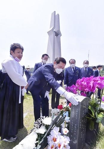 이용섭 광주광역시장이17일 오전 북구 운정동 국립5·18민주묘지에서 열린 '제40주년 5·18민중항쟁 추모제' 행사를 마친 뒤 박관현 열사의 묘비를 어루만지고 있다.