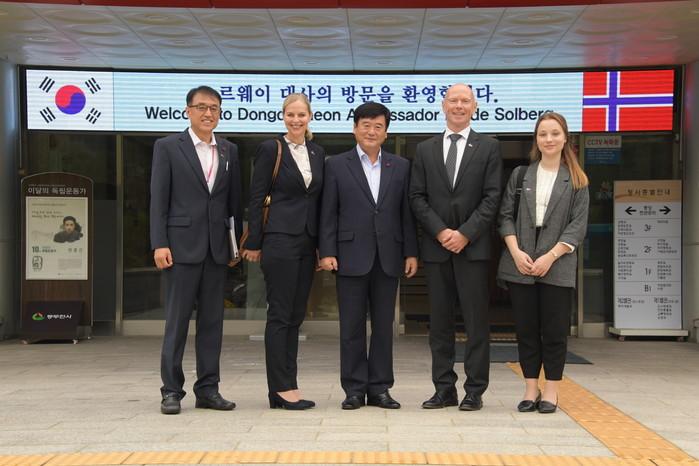 프로데 술베르그(Frode Solberg) 주한 노르웨이 대사(오른쪽에서 두 번째)가 지난 2일 경기 동두천시를 방문해 최용덕 시장(가운데)을 예방하고 뜻깊은 하루를 보냈다. 이날 방문은 '대한민국과 노르웨이 수교 60주년'을 맞이해 주한 노르웨이 대사관에서 동두천시 방문을 요청한 것을 계기로 추진됐다. 사진은 최 시장이 노르웨이 대사 및 관계자들과 기념촬영을 하는 모습.(사진제공=동두천시청)