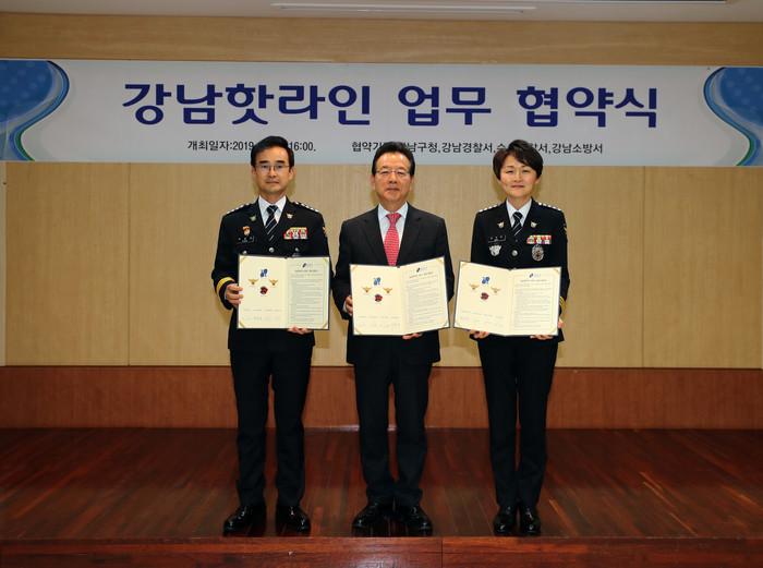 정순균 서울 강남구청장이 최근 강남구청 3층 큰회의실에서 열린 ‘강남핫라인 업무 협약식’을 맺었다. 사진은 박영대 강남경찰서장, 정순균 구청장, 김숙진 수서경찰서장(왼쪽부터)이 협약서에 서명 후 기념촬영을 하고 있는 모습.(사진제공=강남구청)