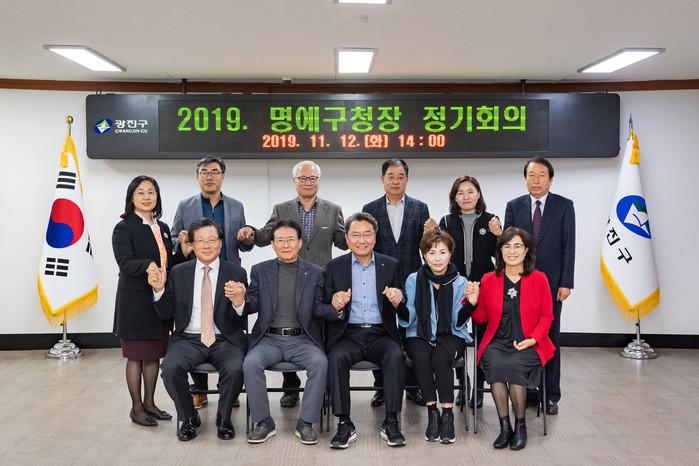 서울 광진구가 지난 12일 구청 기획상황실에서 명예구청장 첫 정기회의를 개최했다. 이날 정기회의에서는 공석이었던 구의1동과 자양3동 명예구청장에 대한 위촉장을 수여하고, 올해 광진구 주요 구정 현안업무에 대해 설명했다. 사진은 회의에 참석한 김선갑 구청장(앞줄 가운데) 및 명예구청장들이 기념촬영을 하는 모습.(사진제공=광진구청)