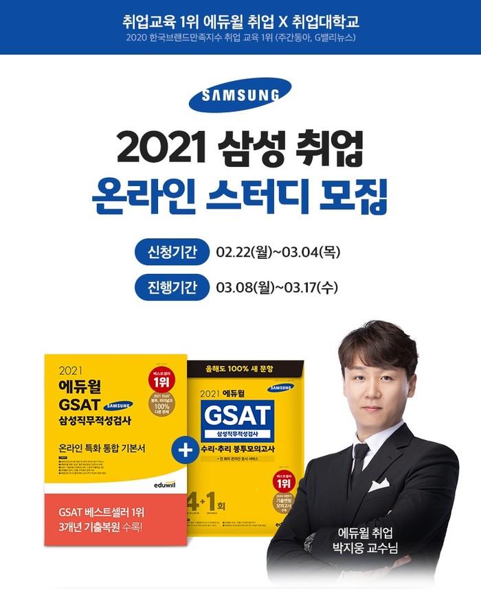 에듀윌 취업에서 마련한 ‘2021년 삼성 취업 온라인 스터디’는 2021년 상반기 삼성그룹 취업을 준비하는 2030 취업준비생이라면 누구나 무료로 참여할 수 있으며, 스터디는 네이버 취업 커뮤니티 취업대학교에서 3월4일까지 참여 신청 가능하다. 활동은 3월8~17일 진행될 예정이다.
