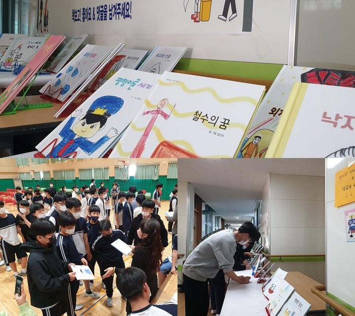 ‘배구의 여신’을 출간한 1학년 최선웅 학생은 ‘저는 어렸을적 그림동화가 떠올라 동화분야를 선택했는데 이런 기회에 책을 만들 수 있어서 행복한 시간이었다. 이야기를 구성하고 색칠하는 과정이 좀 힘들긴 했지만 작가님의 도움을 받아가며 완성시킬 수 있었다. 제가 만든 책을 보니 뿌듯하고 우리가 보는 책과 같은 모습으로 만나보니 괜히 두근거리고 소중하게 느껴진다.’고 웃음꽃을 피웠다.