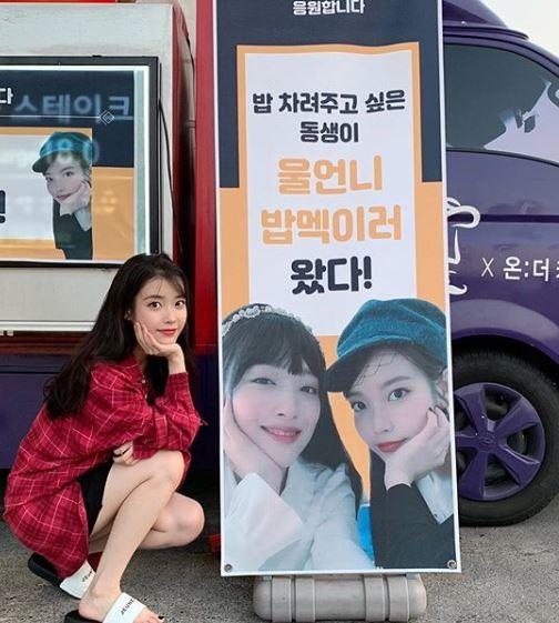 사진 속 아이유는 반바지에 슬리퍼를 신은 수수한 모습으로 밥차 앞에 서 있다. 밥차 앞 '밥 차려주고 싶은 동생이 울언니 밥멕이러 왔다!'는 문구와 함께 아이유와 설리의 사진이 담긴 현수막이 눈에 띈다. 두 사람의 변함 없는 우정이 훈훈함을 자아낸다.