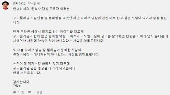 논란이 되자 권혁수는 자신의 커뮤니티에 "사전협의는 없었다"며 구도쉘리와 함께한 동영상을 삭제했다.