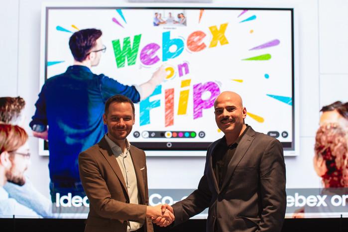 | ▲ 삼성전자가 시스코(Cisco)와 함께 ‘웹엑스 온 플립(Webex on Flip)’을 공개했다. (왼쪽부터) 샌딥 마흐라(Sandeep Mehra) 시스코 웹엑스 담당 상무와 벤 홀메스(Ben holmes) 삼성전자 유럽법인 B2B 마케팅 헤드가 악수를 하고 있다.(사진제공=삼성전자) |