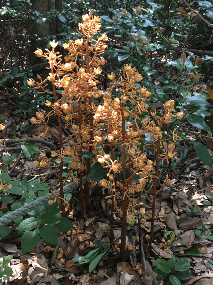 으름난초는 난초과 여러해살이풀로 썩은 균사에 기생하며 전체에 녹색 부분이 없어 광합성을 하지 않는 것이 특징이며, 남방계 식물이지만 내륙으로 덕유산 부근까지 북상해 서식한다.