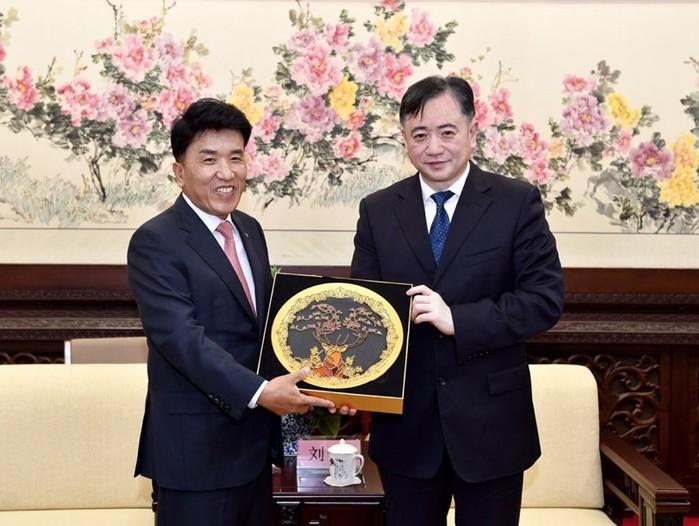| ▲ 함영주 하나금융그룹 부회장(사진 왼쪽)이 중국 길림(지린)성의 성도인 장춘(창춘)시 명예시민으로 선정된 후 지난 9일 중국 길림성 장춘시정부 회의실에서 리우신(LIU XIN) 장춘시 시장(사진 오른쪽)으로부터 기념패를 수여받고 있다.(사진제공=하나은행) |