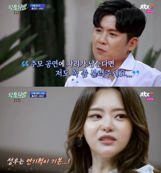 23일 방송된 JTBC2 예능 프로그램 '악플의 밤'에서는 홍경민, 서유리가 게스트로 출연, 자신들을 향한 악플을 낭송했다. 홍경민이 먼저 단상에 올라 악플을 낭송했다.
