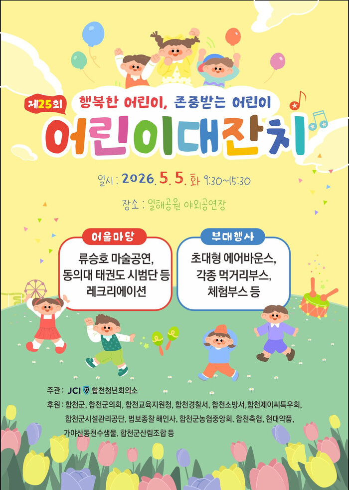 오범서 합천청년회의소 회장은 “우리 아이들이 스스로 얼마나 소중한 존재인지 느끼고, 마음껏 꿈을 펼칠 수 있는 하루가 되길 바란다.”며 “합천의 어린이들이 가족과 함께 웃고 즐기며 행복한 추억을 담아갈 수 있도록 행사 준비에 최선을 다하겠다”고 전했다.
