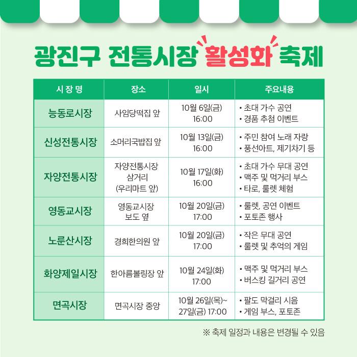 신성전통시장은 13일에 노래자랑과 제기차기를, 자양전통시장은 17일에 가수공연과 맥주부스 등을 선보인다. 영동교시장과 노룬산시장은 20일에 룰렛 이벤트와 공연을, 화양제일시장은 24일에 맥주부스와 버스킹 공연 등을 운영한다. 마지막으로 면곡시장은 26일, 27일 이틀간 막걸리 시음행사, 게임부스와 포토존을 준비한다.