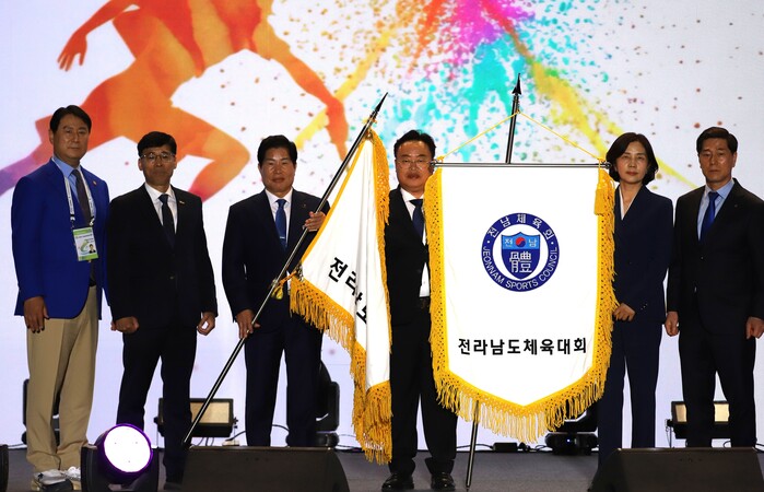 | ▲ 대회기, 패넌트기 전달후 단체사진(사진=전남도체육회) |
