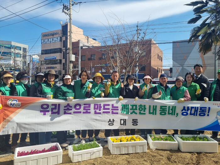 이번 활동에는 상대동 새마을지도자협의회(회장 하만명)와 새마을부녀회(회장 손혜숙)가 참여해 봄맞이 환경정비의 일환으로 상대동 행정복지센터를 비롯한 관내 주요 도로변 5곳에 꽃길을 조성하고 소공원을 정비하며 ‘살기 좋은 상대동 만들기’에 힘을 보탰다.