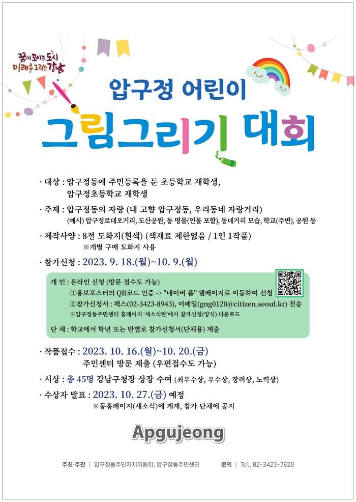 이재호 압구정동장은 “압구정 초등학생들이 그림 그리기 대회를 통해 지역 사회에 대한 자부심을 느끼는 계기가 되길 바란다”며 “이번 대회에 많은 관심과 참여를 부탁드린다”고 말했다.