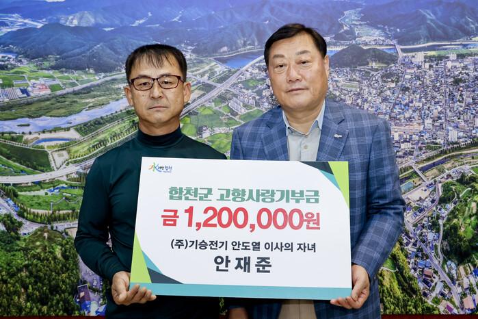 김윤철 합천군수는 “안도열 부자(父子)의 따뜻한 합천 사랑에 감사드린다”며 “소중한 기부금은 군민 복지와 군 발전을 위해 꼭 필요한 사업에 사용하겠다”고 말했다.