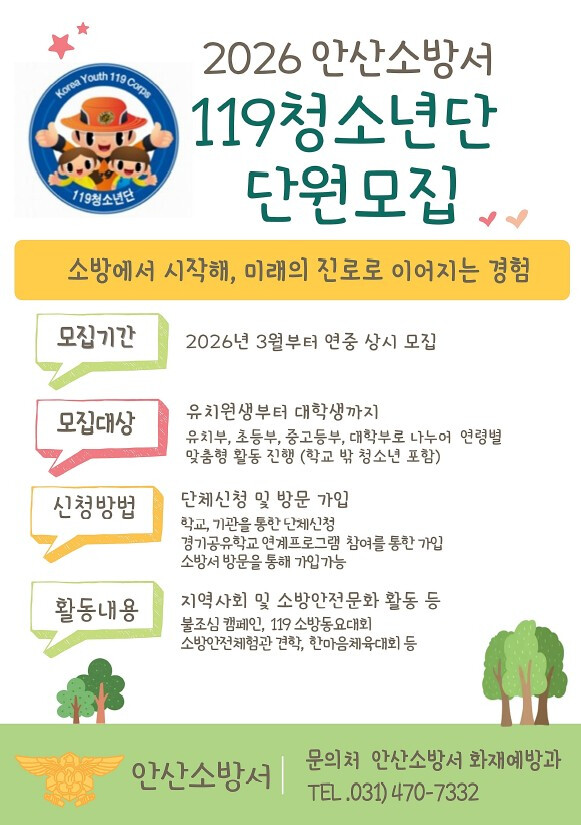 [안산=송윤근 기자] 경기 안산소방서는 어린이와 청소년의 안전의식 함양과 미래 안전리더 양성을 위해 ‘2026년 119청소년단’을 연중 상시 모집한다고 2일 밝혔다.