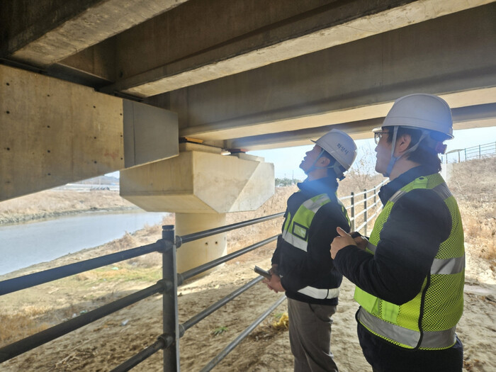 | ▲ 최병주 효행구청장이 동화교 하부 균열 및 침하 여부를 현장에서 점검하고 있다 /사진제공=화성특례시 |