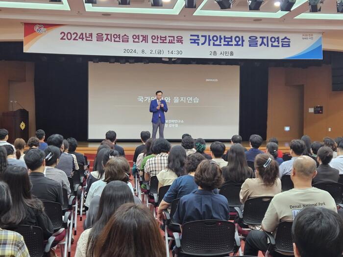 이번 안보교육은 공직자와 시민의 안보의식을 높이고 을지연습에 대한 경각심을 심어주기 위해 마련되었으며, 안보전문가 강우철 (사)통일안보전략연구소장이 ‘국가안보와 을지연습’이라는 주제로 강의를 진행했다.