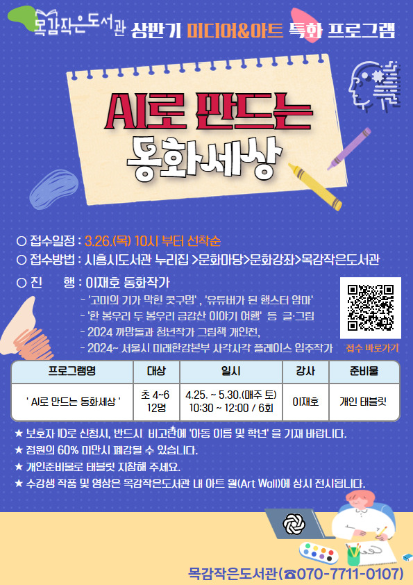 완성된 수강생 작품과 영상은 도서관 내 ‘아트월(art wall)’에 상시 전시될 예정이며, 지역 이야기를 담은 동화책은 시민 참여형 디지털 아카이브로도 구축할 계획이다.