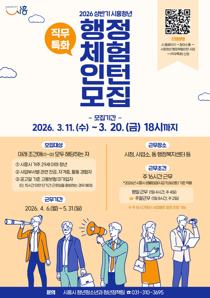 참여를 희망하는 청년은 시흥시청 누리집의 ‘참여소통’ 메뉴 내 ‘시흥청년 행정체험 인턴사업’에서 지원할 수 있는 사업별 근무 내용 등을 확인한 뒤 ‘(직무특화) 행정 체험 신청’ 메뉴를 통해 온라인으로 신청하면 된다.