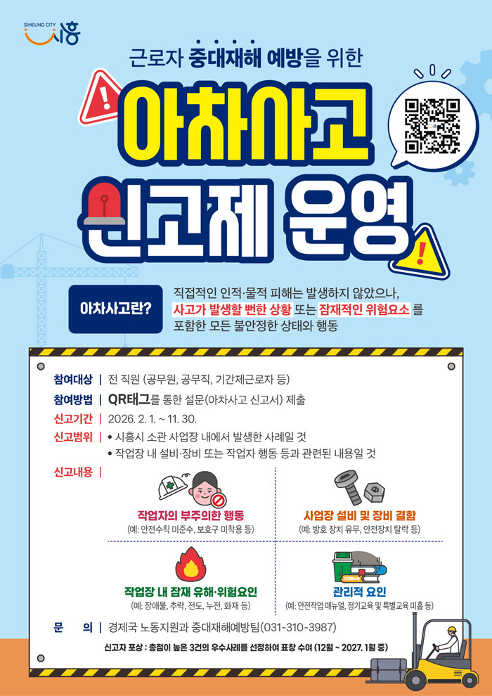 [시흥=송윤근 기자] 경기 시흥시는 근로자의 자기 규율 안전 문화 조성과 현장 중심의 산업재해 예방 활동 활성화를 위해 오는 2월 1일부터 ‘아차사고 신고제’를 운영한다.