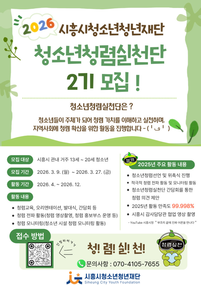 모집 대상은 관내 13세부터 20세까지의 청소년이며, 모집 기간은 3월 9일부터 27일까지다. 참여를 희망하는 청소년은 (재)시흥시청소년청년재단 누리집 또는 누리소통망을 확인하거나 홍보 포스터에 기재된 정보무늬(큐알코드)를 통해 신청할 수 있다. 관련 문의는 시흥시청소년청년재단으로 하면 된다.