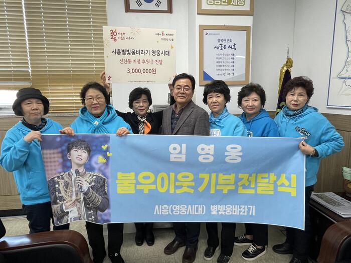 [시흥=송윤근 기자] 경기 시흥시 신천동 행정복지센터(동장 신화철)에 지난 12월 17일 트로트 가수 임영웅의 시흥 팬클럽인 ‘시흥별빛웅바라기 영웅시대’가 방문해 연말을 맞아 지역 저소득 취약계층의 겨울나기 지원을 위한 후원금 300만 원을 전달했다.