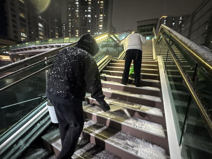 | ▲지난 4일 저녁 강설이 내린 가운데 정왕1동에 있는 육교에서 제설작업을 벌이고 있다 /사진제공=시흥시 |