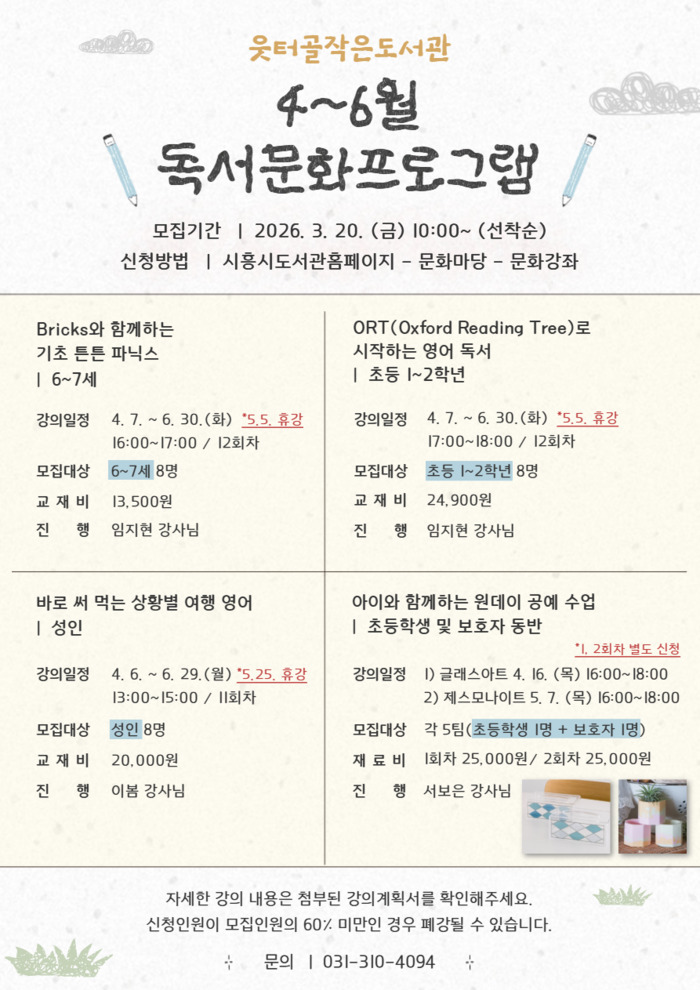 프로그램 신청은 3월 20일 오전 10시부터 도서관 공식 누리집 또는 앱(App)을 통해 선착순으로 할 수 있다. 자세한 사항은 시흥시 도서관 누리집을 참고하거나 소래빛도서관 작은도서관팀으로 문의하면 안내받을 수 있다.